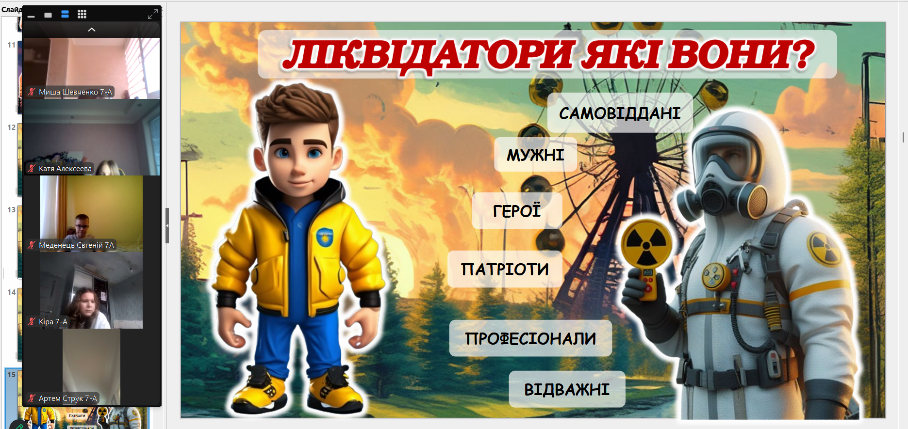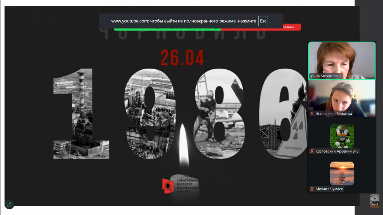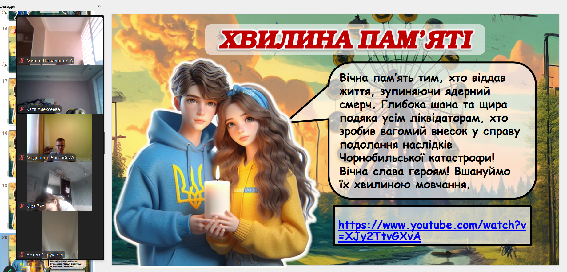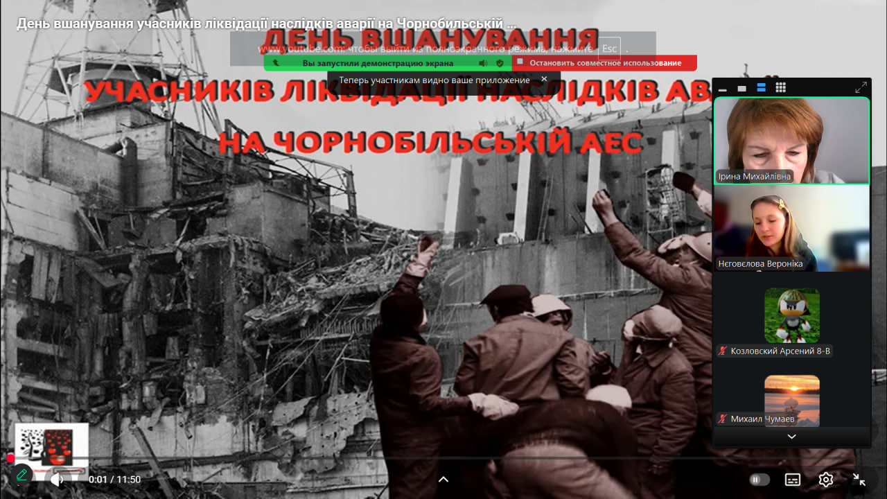 Чорнобильська катастрофа – найбільша за всю історію ядерної енергетики. В житті українців Чорнобиль є незаживаючою раною болю і втрат. Масштаби лиха та важкість наслідків стали найтяжчими в історії нашої планети. Героїзм ліквідаторів врятував мільйони життів, врятував світ. Ціною свого життя і здоров’я, під великими дозами опромінення вони зупинили невидимого і дуже підступного ворога. Сьогодні наш обов’язок – пам’ятати про учасників ліквідації аварії на Чорнобильській АЕС, які є прикладом мужності, згадати про їхню самовідданість і жертовність, та вшанувати тих, хто віддав своє здоров’я і життя заради безпеки наступних поколінь і майбутнього України. З вихованцями спеціальної школи проведені інформаційні хвилини, години спілкування тощо