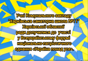Вихованці санаторної школи № 11 взяли участь у Всеукраїнському форумі національно-патріотичного єднання «Україна понад усе». Вчителі фізичної культури Кулик Н.Є. та Лавріненко Т.М. провели святкову руханку