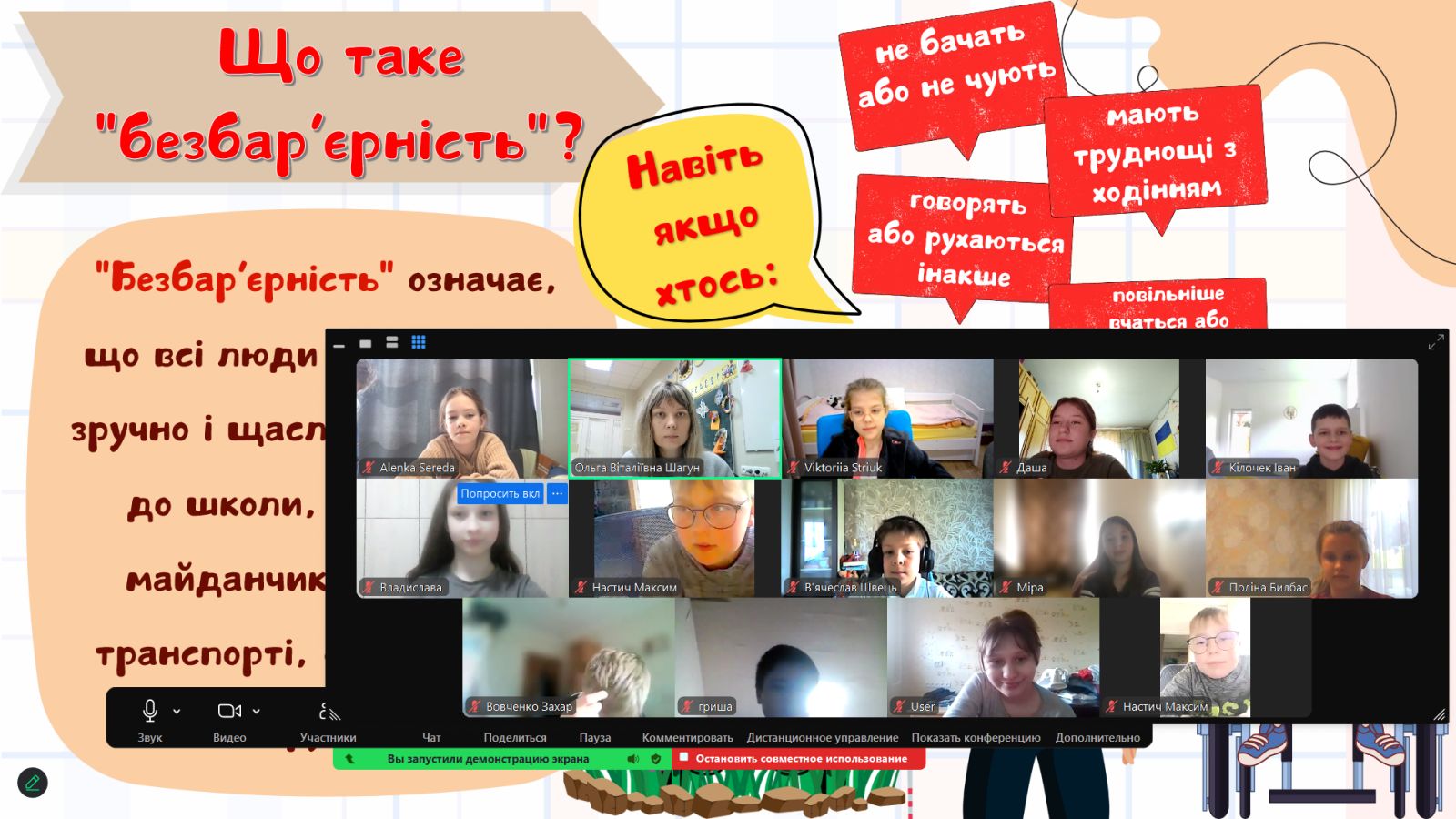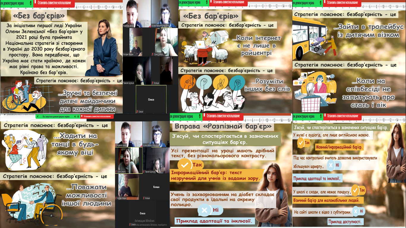 Проведені інтерактивні години спілкування: «Дружні серця без бар’єрів», «Маленькі серця без бар’єрів», «Безбар’єрність: тренд людяності»? «Світ без перешкод: Шлях до безбар’єрного», «Безбар’єрність-це бачити людей серцем».