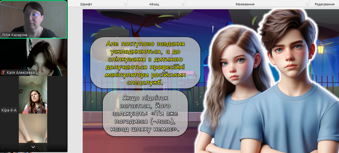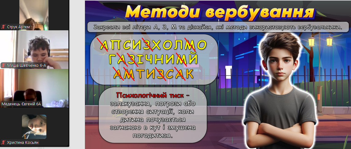 У рамках спільної інформаційної кампанії Центру стратегічних комунікацій та інформаційної безпеки «Dovidka.Info» і Служби безпеки України вихованці 7-Б класу переглянули відео ролі та проведено урок з безпеки життєдіяльності «Вербування: як не потрапити у пастку», який викриває схеми вербування громадян України російською ФСБ. За даними, лише з початку 2025 року зафіксовано сотні випадків спроб вербування. Особливе занепокоєння викликає той факт, що 22% завербованих становлять неповнолітні особи