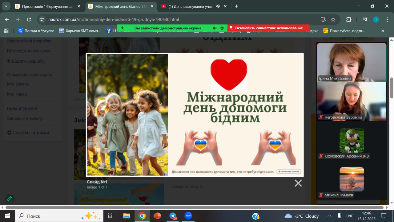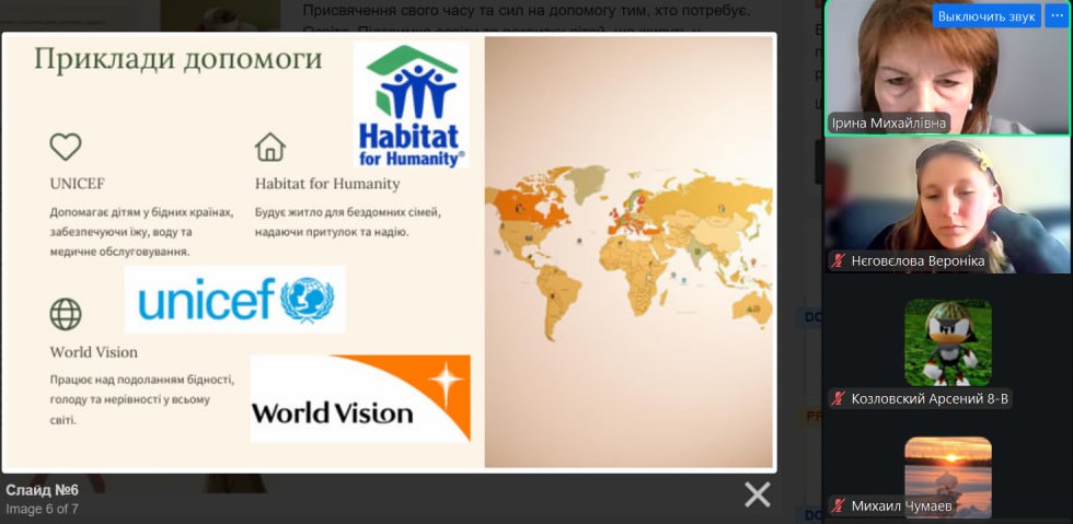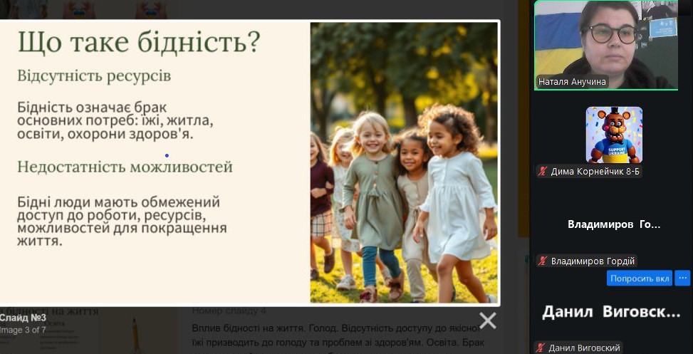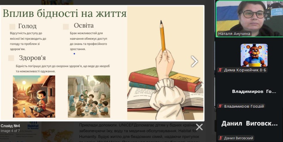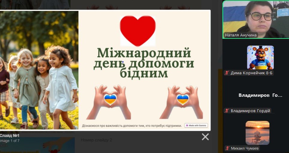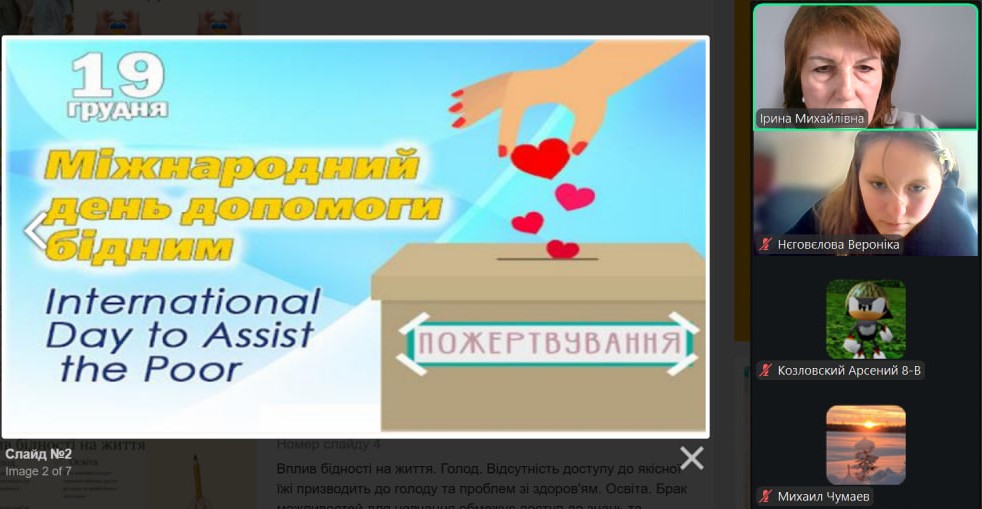 Міжнародний день допомоги бідним відзначається щорічно 19 грудня. Ця подія була встановлена Організацією Об’єднаних Націй у 1995 році. У той період майже одна четверта частина населення всієї планети (1,5 млрд. чоловік) проживала за межею крайньої бідності. Природно, що проблема бідності вимагала розробки планів щодо її якнайшвидшого викорінення. Цей день нагадує, що боротьба з бідністю — це спільна відповідальність суспільства та важлива умова гідного життя для кожної людини. З вихованцями 8-х класів проведена інформаційна хвилина: «Чому допомога бідним — відповідальність усього суспільства»