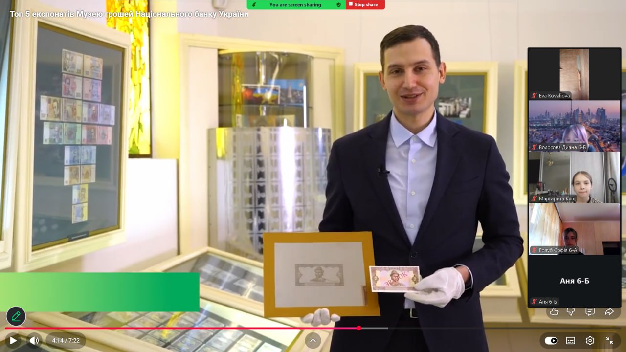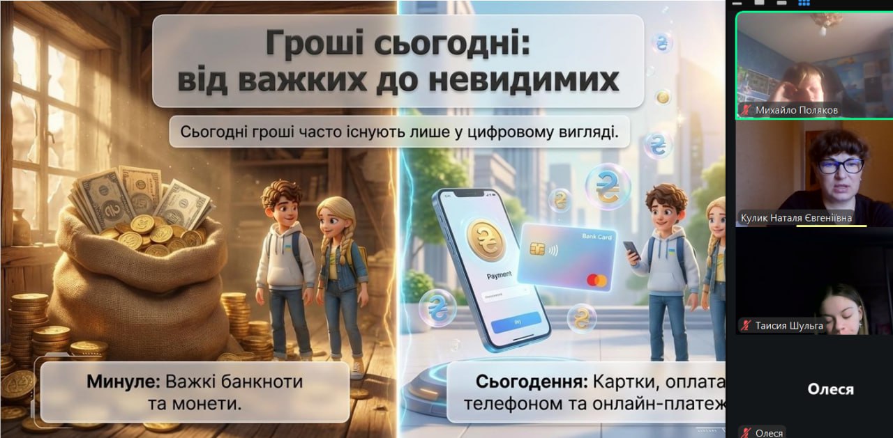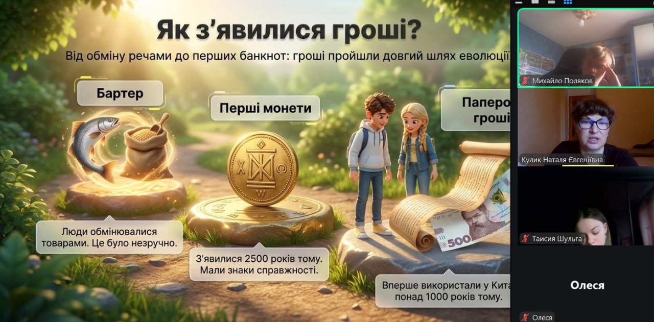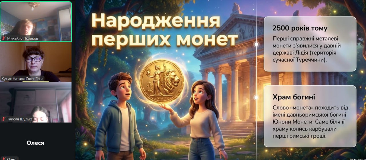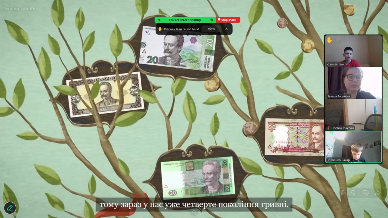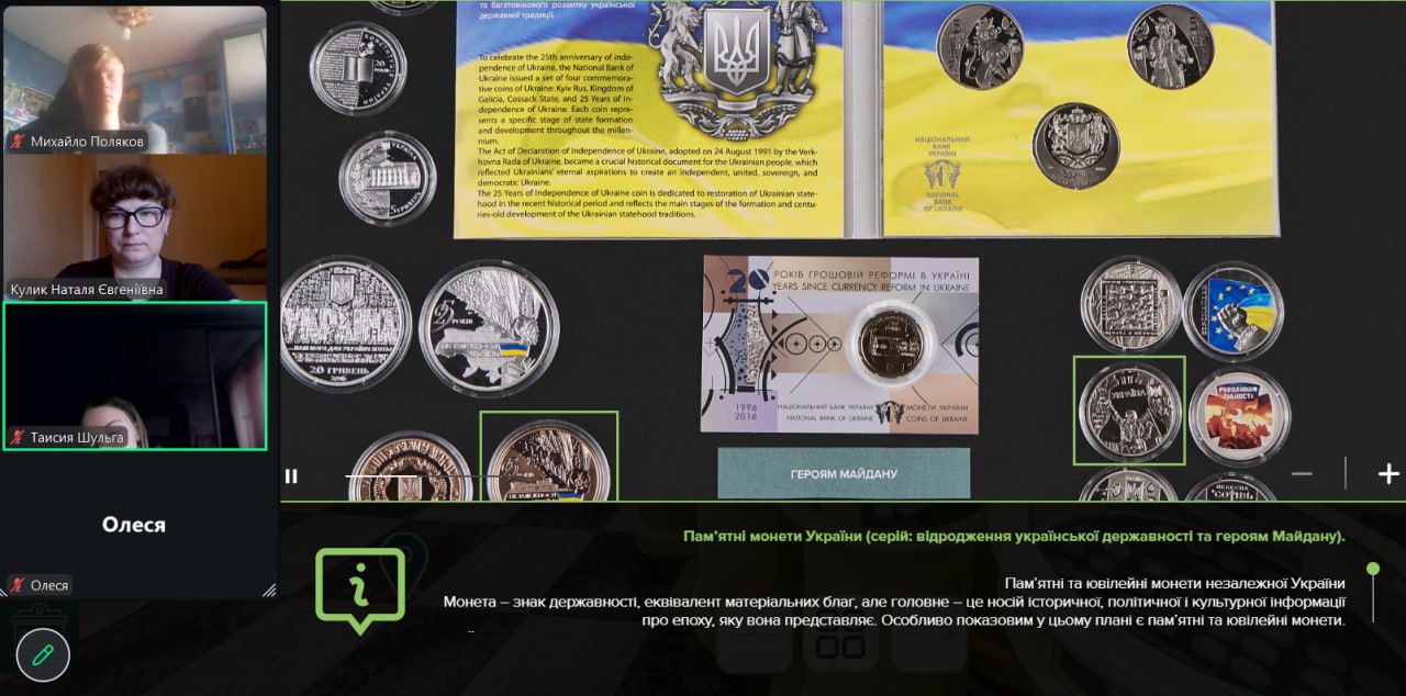 Онлайн-екскурсія до музею грошей стала справжнім відкриттям. Учні з цікавістю розглядали старовинні монети, дивувалися їхньому вигляду та обговорювали, як змінювалися гроші з часом. Старші учні активно дискутували про кредити — хтось вважав їх корисними, а хтось ризикованими. Було приємно спостерігати, як формується власна думка. Розповіді про українську гривню викликали гордість та інтерес — багато хто вперше звернув увагу на деталі, які раніше здавалися непомітними.