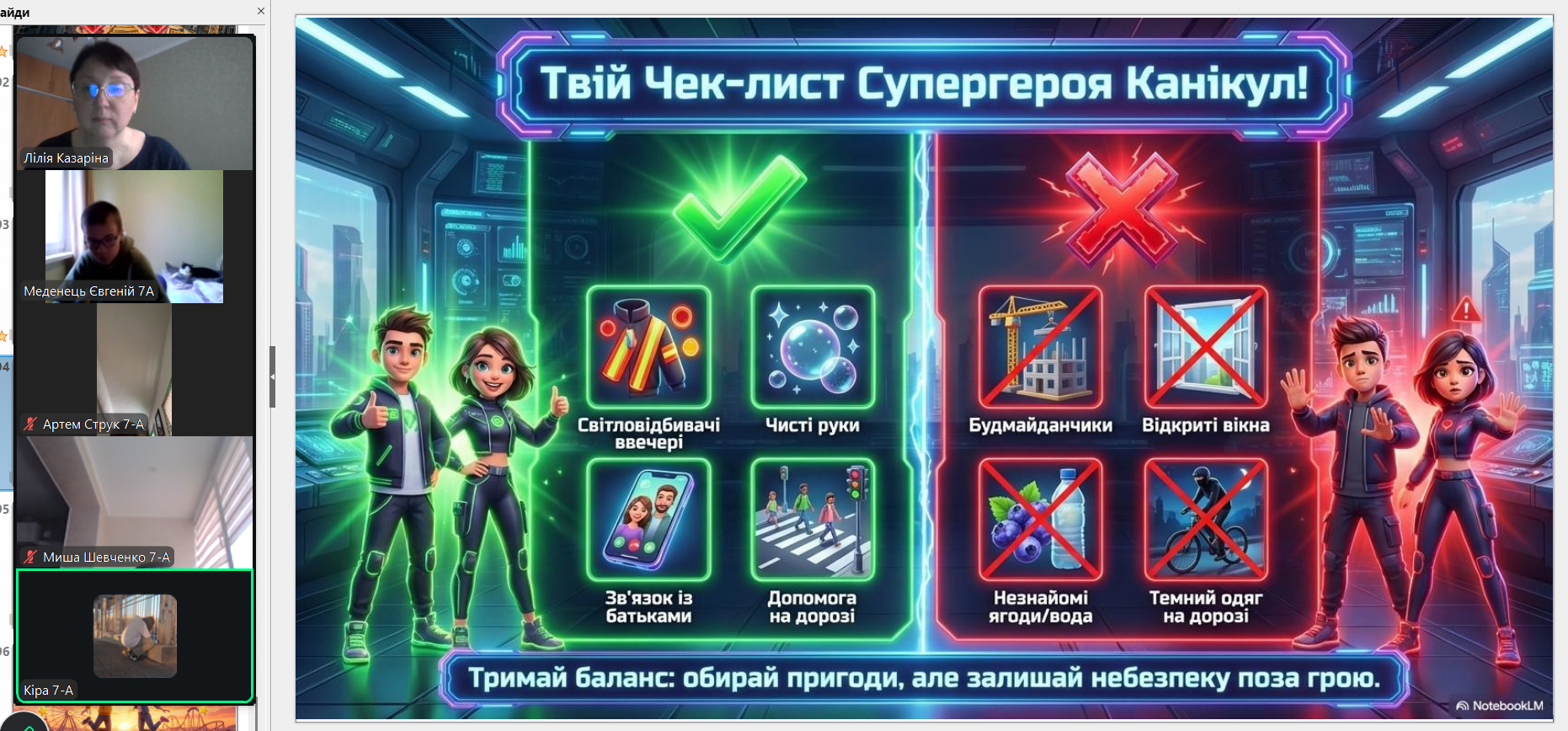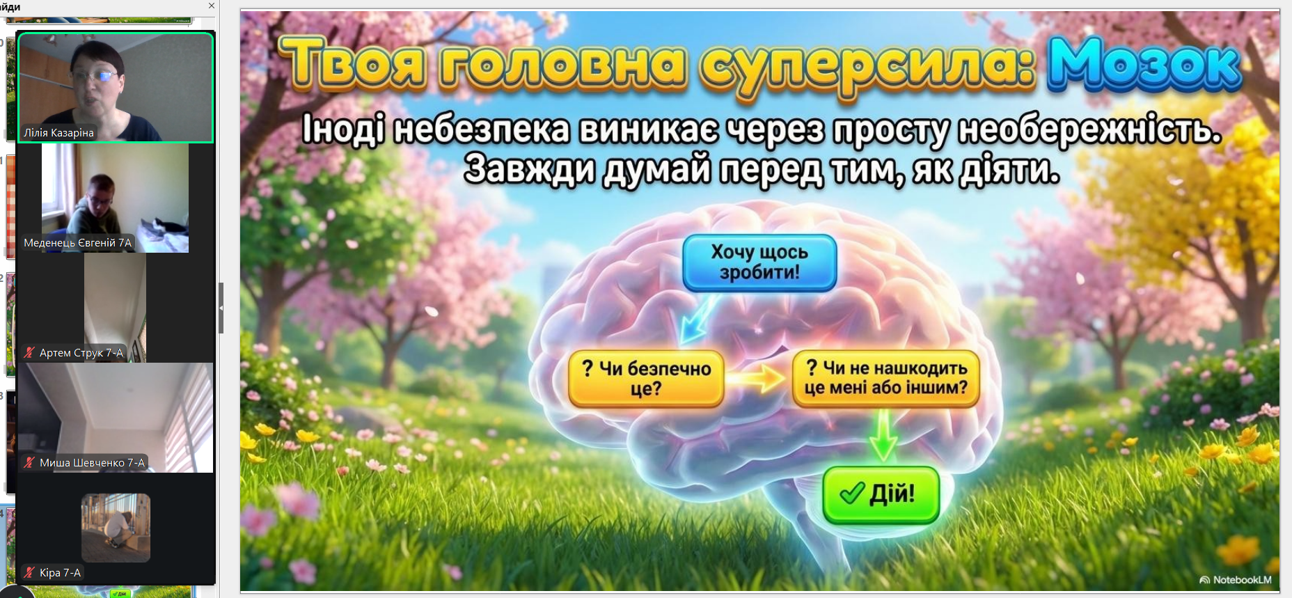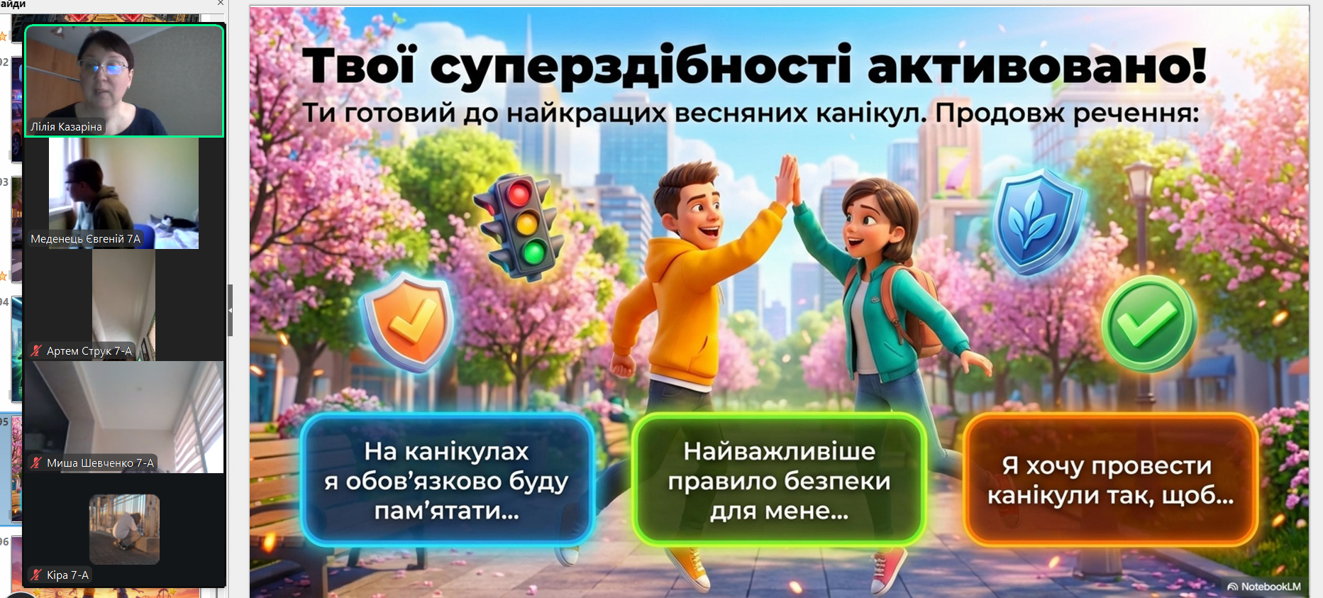 Весна — це час оновлення, теплих днів і довгоочікуваного відпочинку. Проте, щоб весняні канікули залишили лише приємні спогади, важливо пам’ятати, що безпека — це не обмеження свободи, а запорука гарного настрою та здоров’я. З учнями 1-9-х класів проведені бесіди про правила безпеки на канікулах: правила поведінки на водоймах, вкритих кригою; правила поведінки на воді (танення льоду); поведінки під час ожеледиці; правила поведінки під час повітряної тривоги; правила пожежної безпеки під час святкування новорічних свят; правила протипожежної безпеки; безпека вдома; безпека на вулиці; безпека в громадських місцях; правила дорожнього руху (самокати, велосипеди); інтернет-безпеку (кібербулінг, шахраї); номери екстрених служб тощо