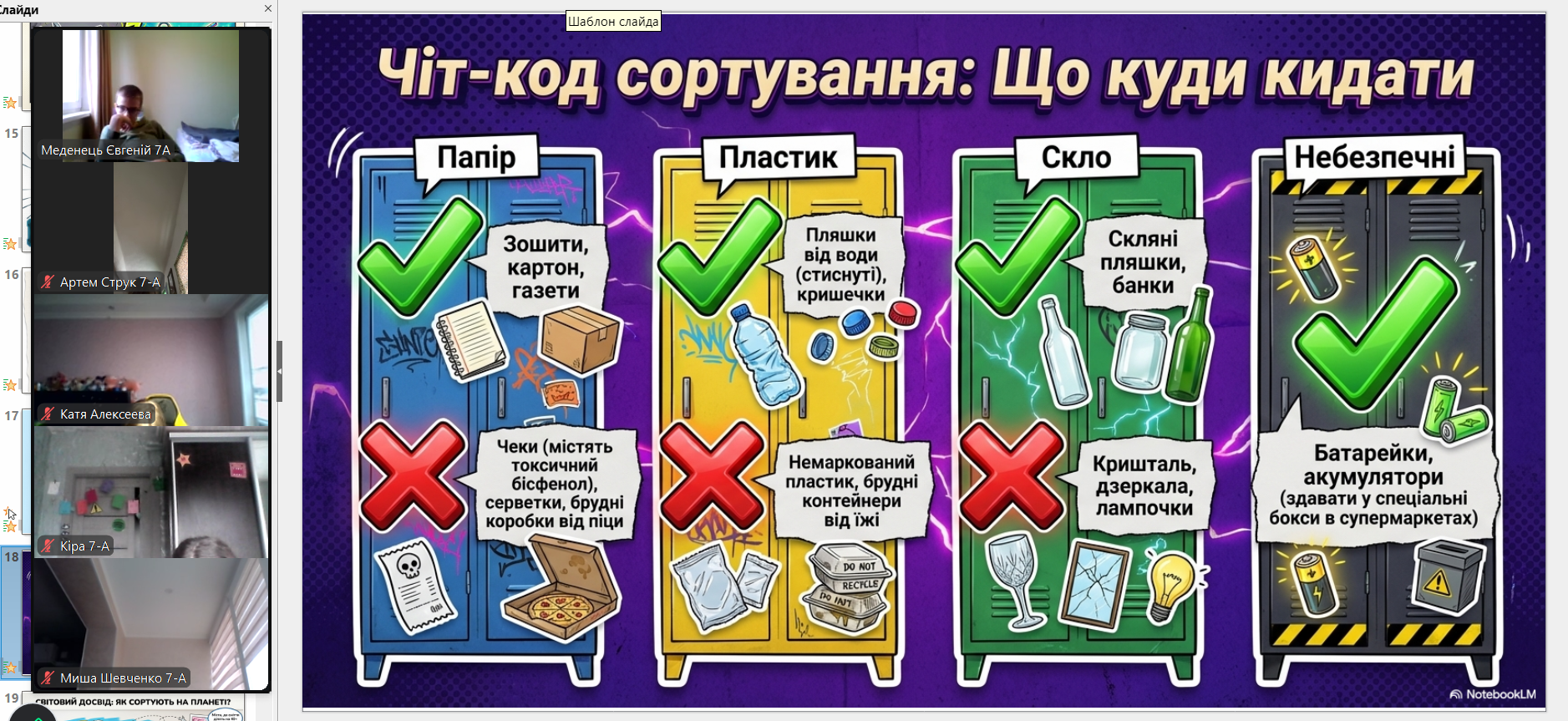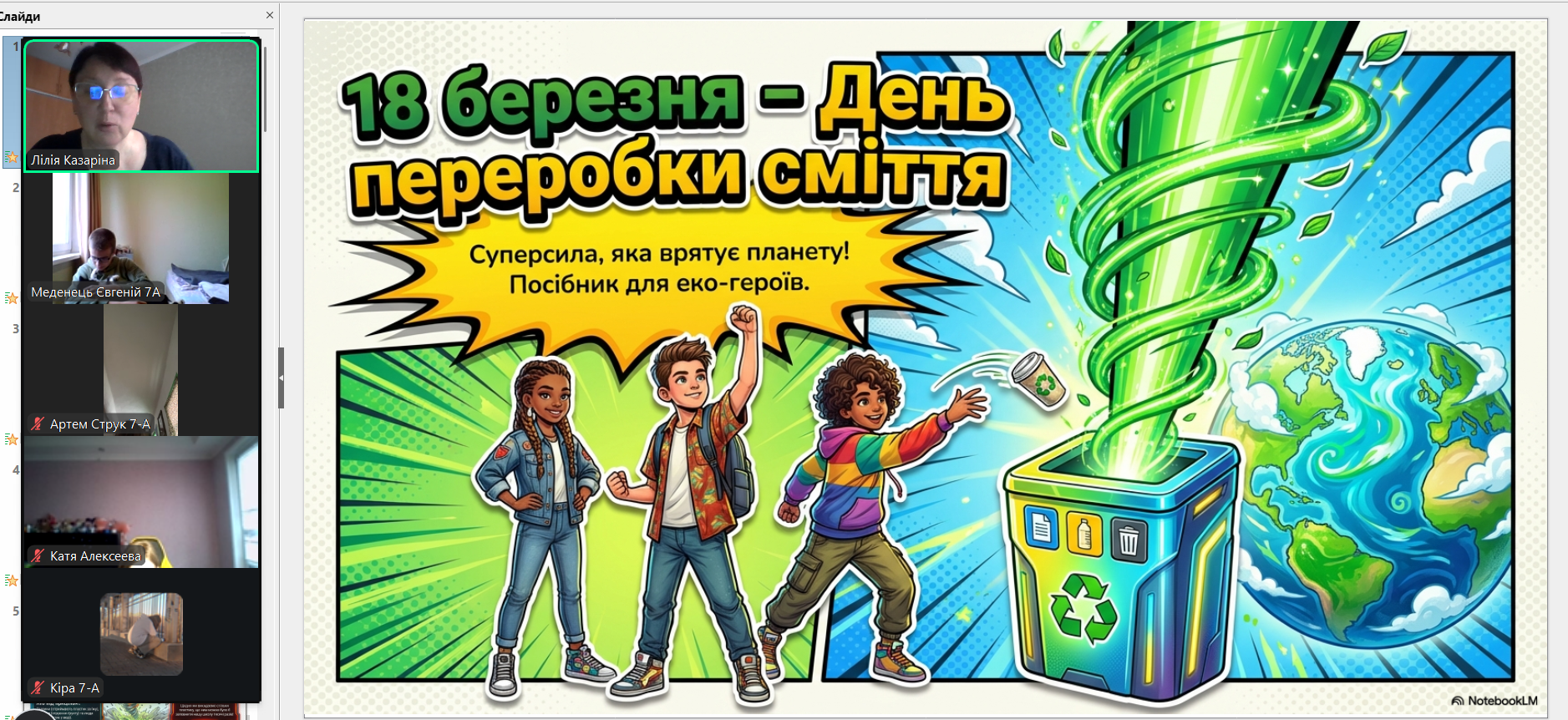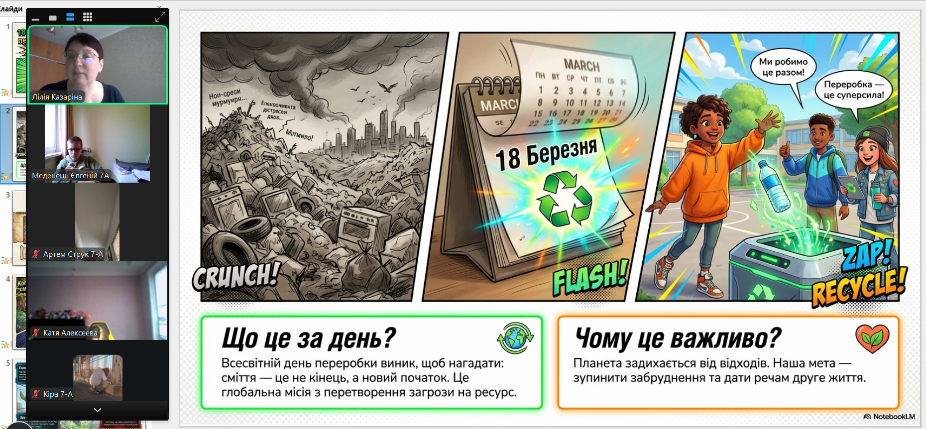 Всесвітній день переробки (Global Recycling Day) відзначається щорічно 18 березня (започаткований у 2018 році), щоб привернути увагу до раціонального використання ресурсів та сортування сміття. Головна мета – перетворити відходи на цінні ресурси, зменшити їх кількість на полігонах та зберегти довкілля, підтримуючи принципи «сміття – це ресурс» з вихованцями 7-А класу проведена виховна година. Учні вчилися сприймати сміття як цінний ресурс, обговорили правила сортування та важливість вторинної переробки для збереження довкілля. Формуємо екозвички разом!