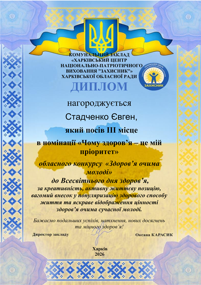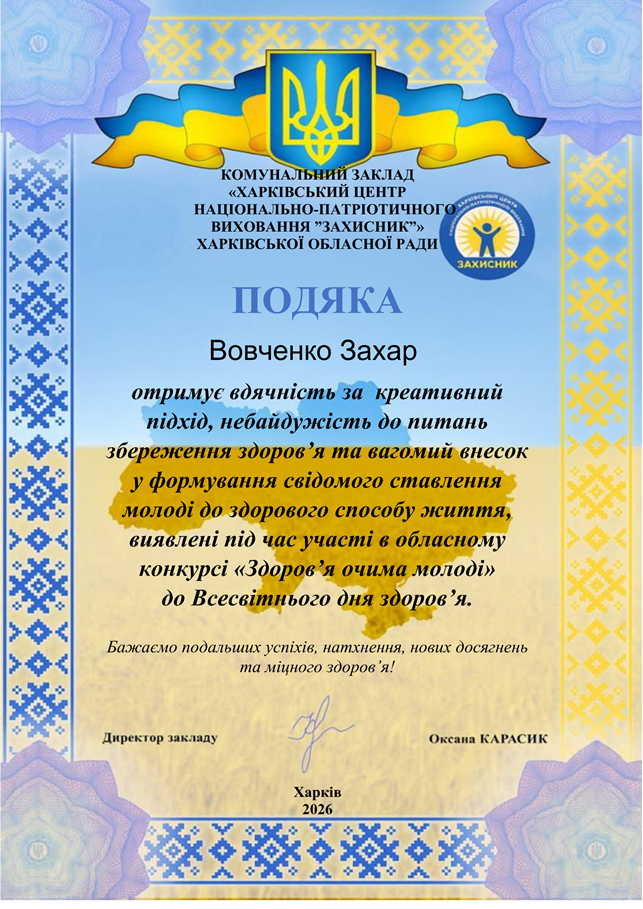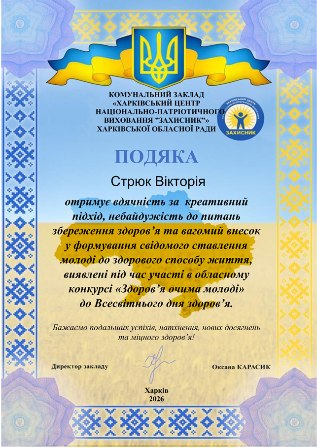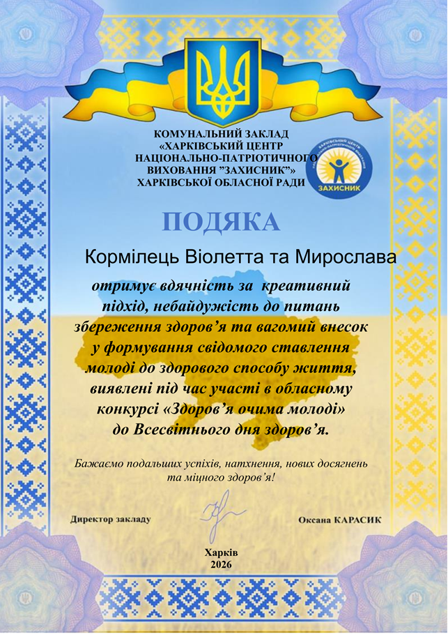 Пишаємося нашими учнями, які взяли активну участь в обласному конкурсі «Здоров’я очима молоді», організований КЗ “Харківський центр національно-патриотичного виховання ” Захисник ” Харківської обласної ради!