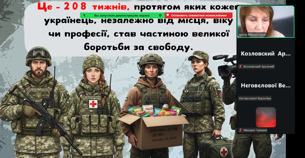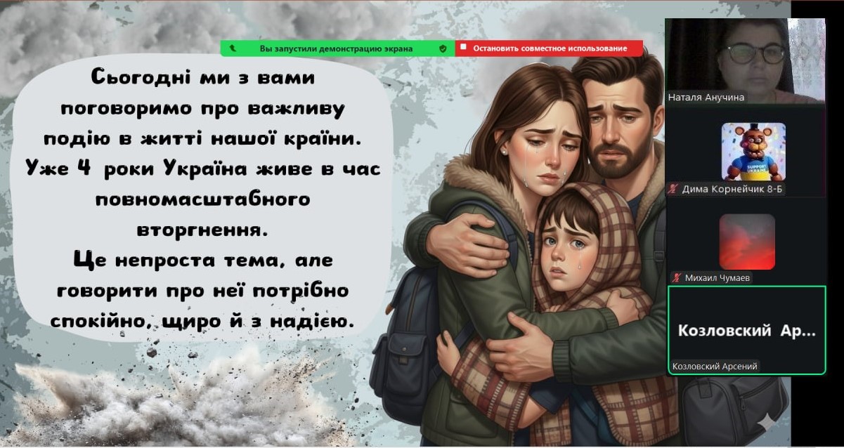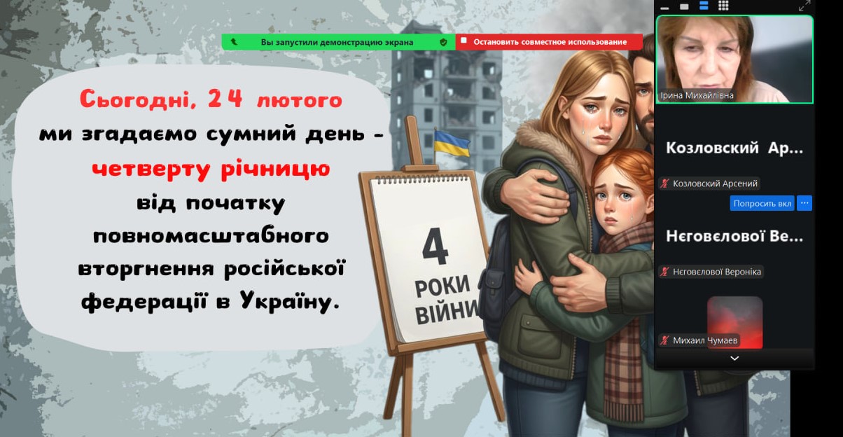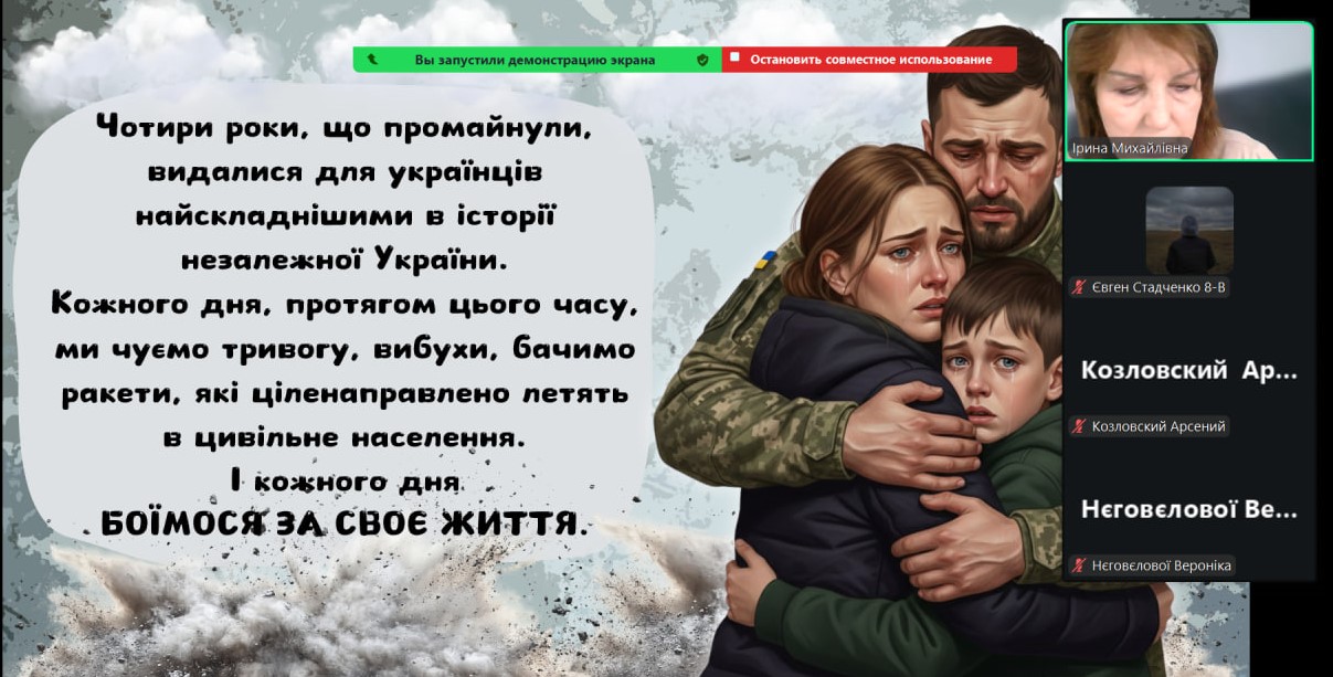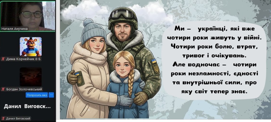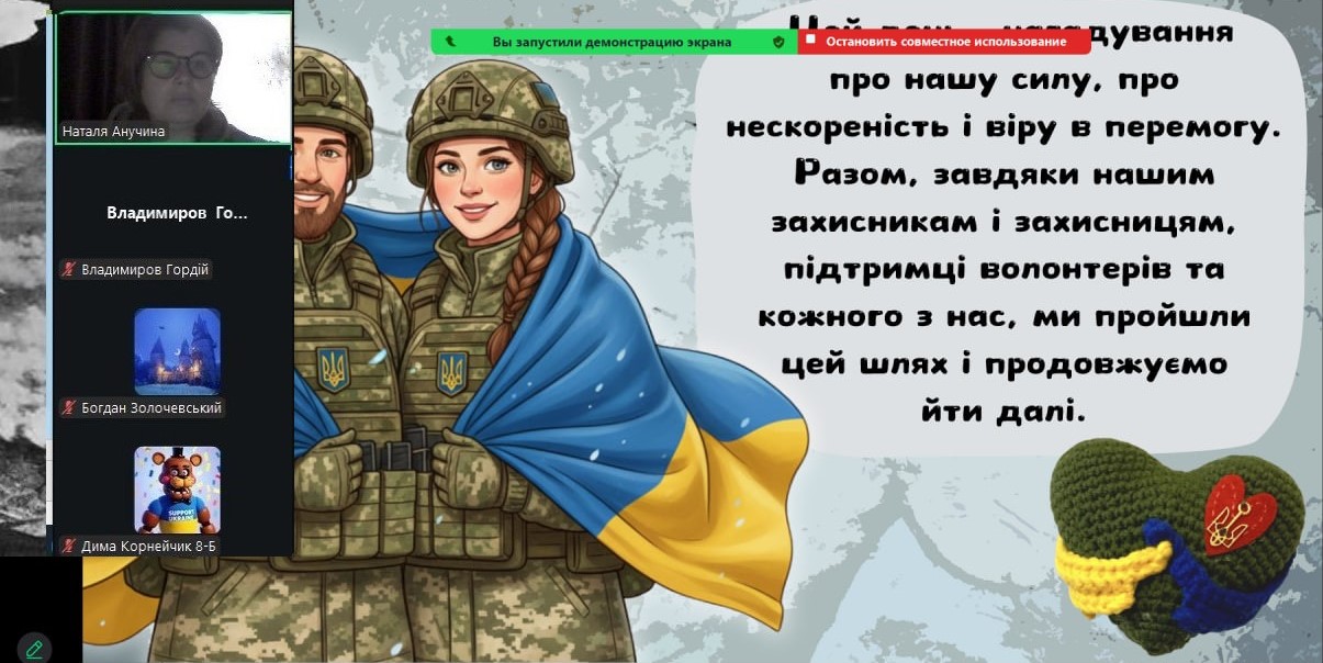 Сьогодні наші монітори світилися особливим світлом — вчителі та вихователі провели з учнями онлайн-зустрічі, присвячені боротьбі України за свободу. Хоч ми й розділені екранами, але єдині в наших думках та прагненнях. Ми говорили про силу нашої єдності, про незламний дух народу та те світле, мирне майбутнє, яке ми обов’язково збудуємо разом. Сьогодні ми вшановуємо пам’ять кожного Героя, хто віддав життя за нашу землю. Під час онлайн-включень діти та педагоги схилили голови у хвилині мовчання. Ми пам’ятаємо ціну нашої свободи й несемо цю пам’ять у своїх серцях. Вічна шана полеглим… Особливі слова вдячності сьогодні лунали для захисників і захисниць, які зараз на фронті. Завдяки вашій мужності наші учні мають змогу вчитися, мріяти та навіть у складні часи відчувати підтримку школи.
