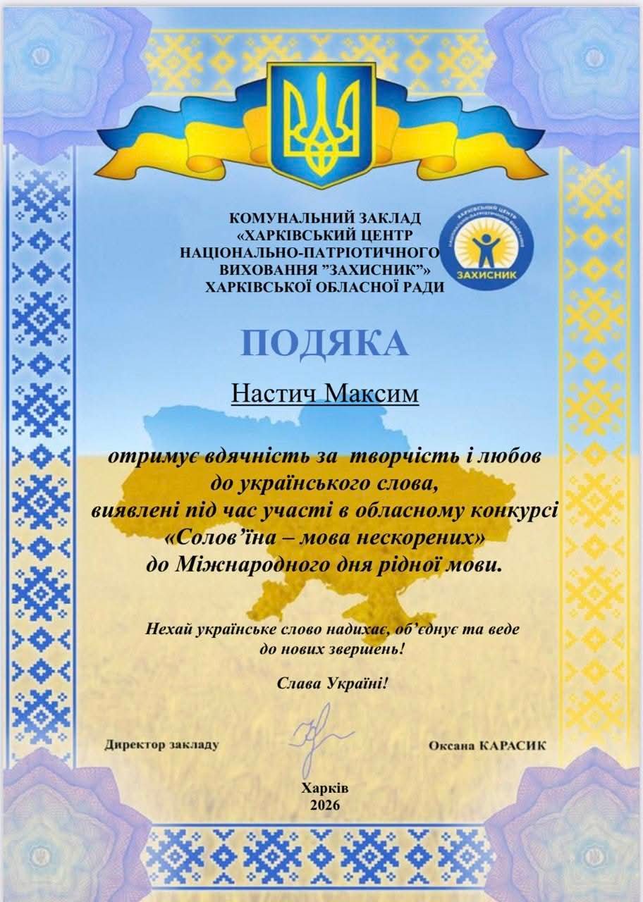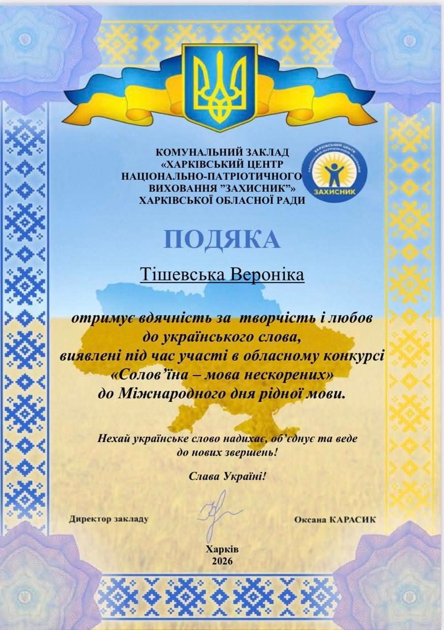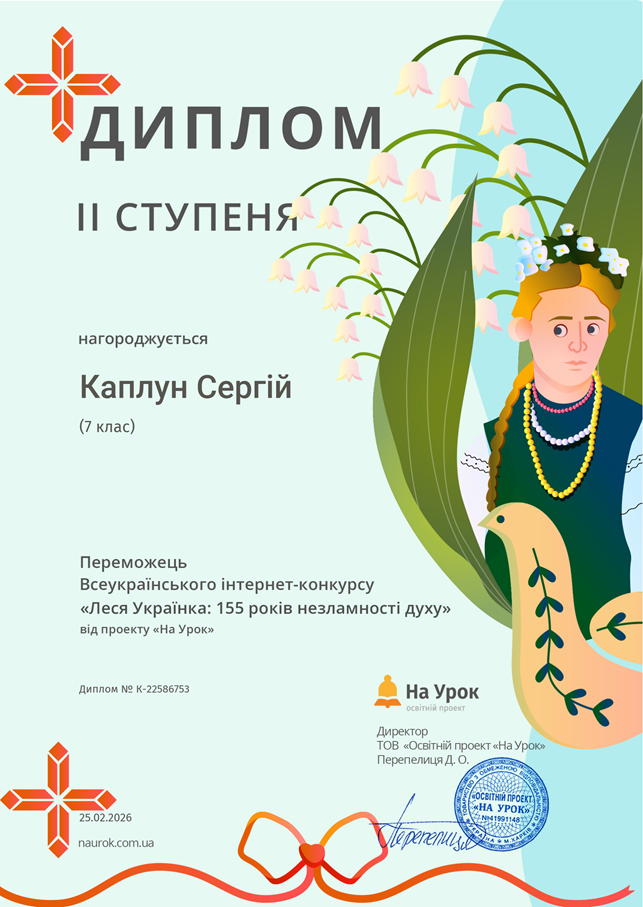 Вихованці взяли участь у Всеукраїнському конкурсі «Леся Українка: 155 років незламності духу» від проєкту «На Урок» учні продемонстрували чудові знання про життя та творчість поетеси та отримали дипломи І, ІІ та ІІІ ступенів