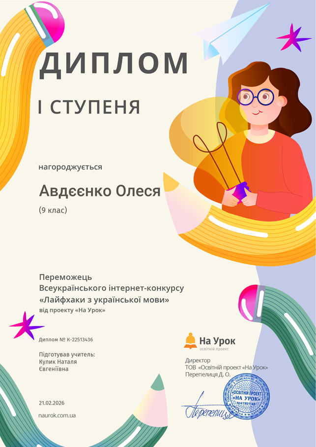 Авдєєнко Олесю ( 9- А клас).