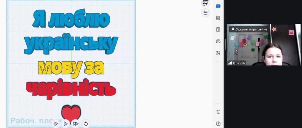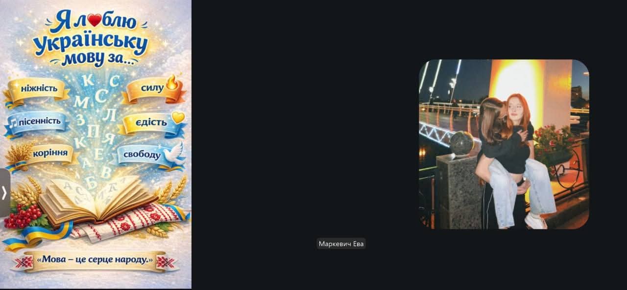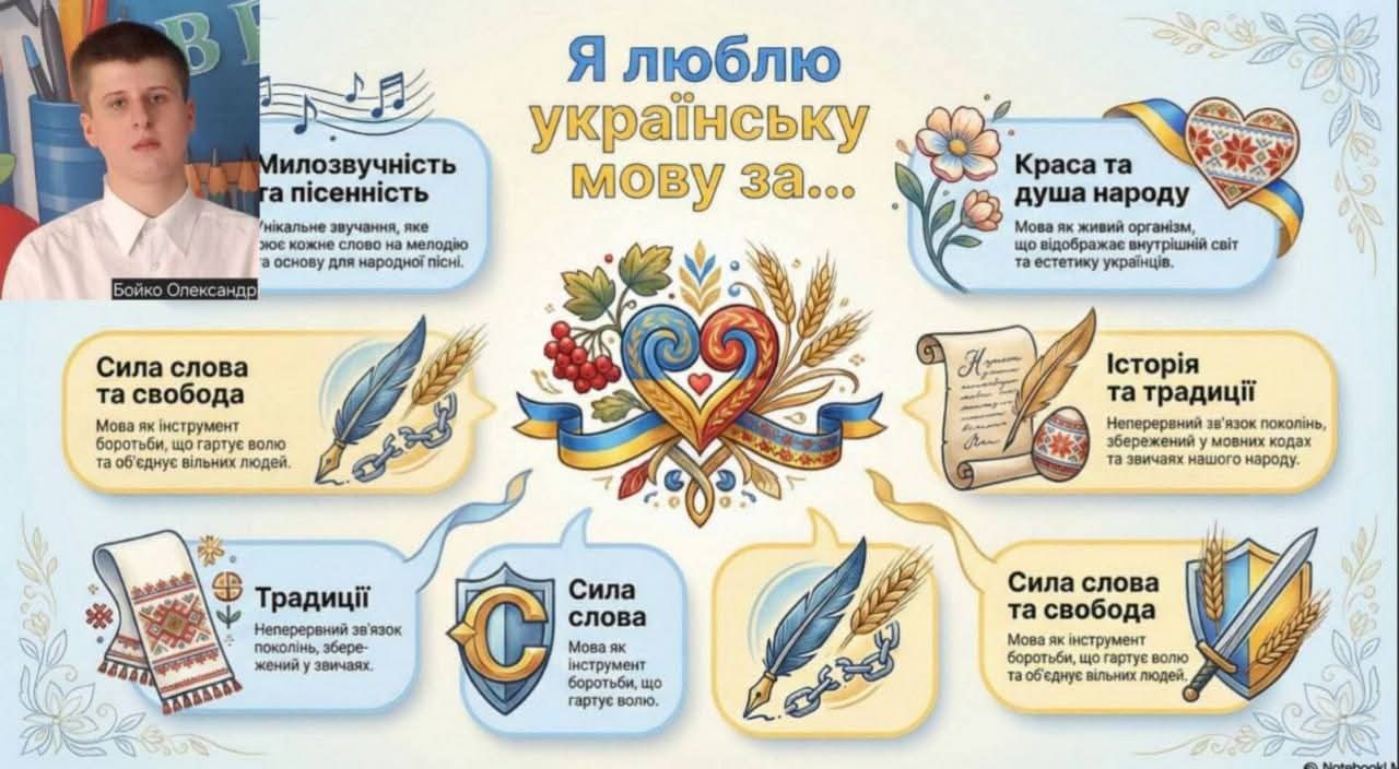 Дуже креативно пройшов в нашій школі онлайн флешмоб «Я люблю українську мову за…». Це був не просто захід, а справжнє зізнання в любові до рідного слова! А на уроці вчитель інформатики Билбас Анна Юріївна разом з учнями довела: наша мова чудово звучить і в цифровому світі. А замість ножиць та клею- графічні редактори! Всі: учні, вчителі та навіть батьки долучилися до акції, ділячись своїми думками. Виявилося, що ми любимо нашу мову за: