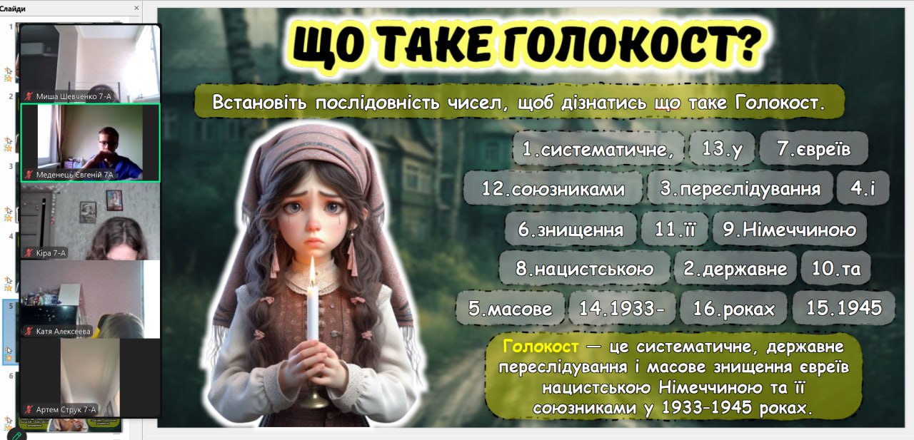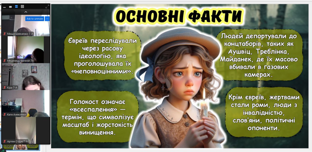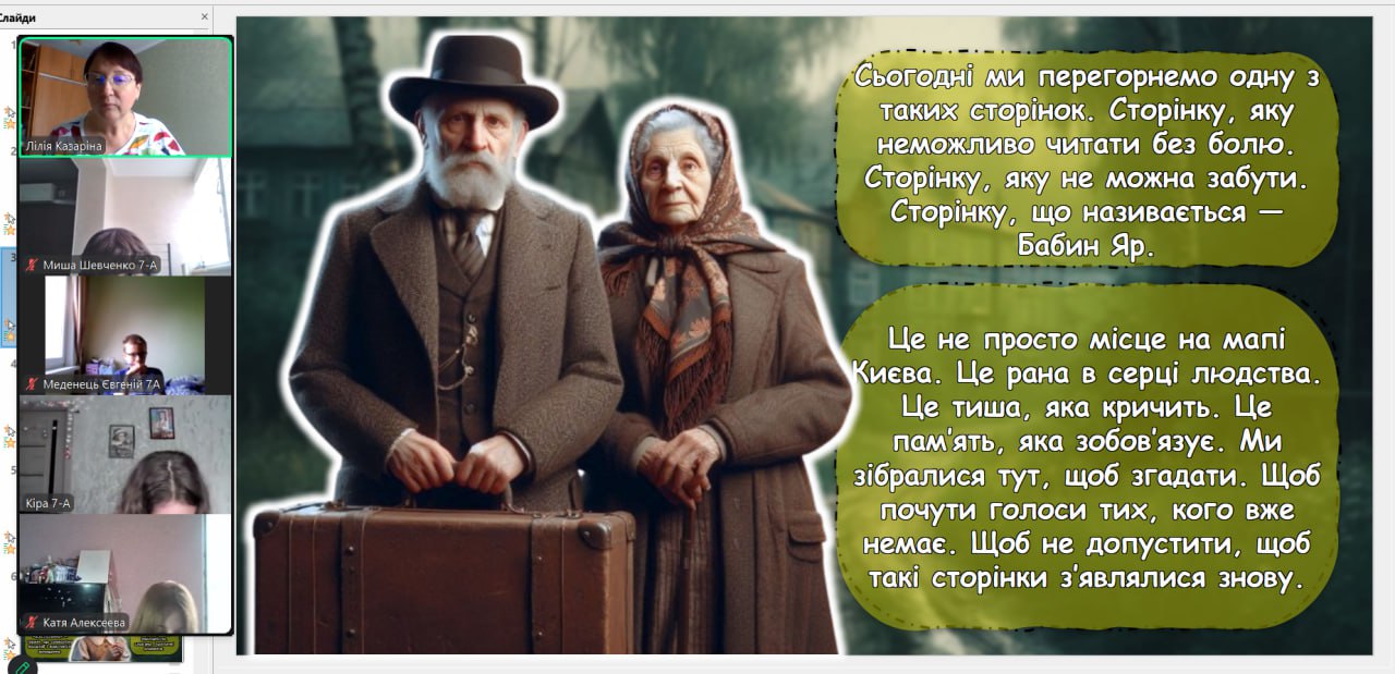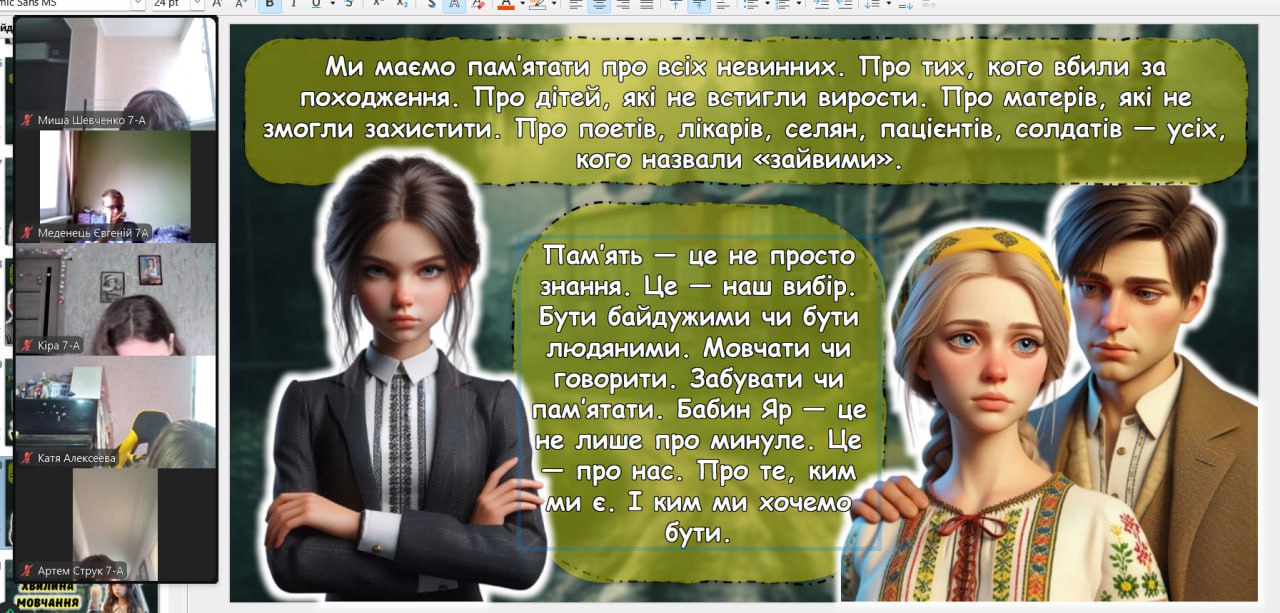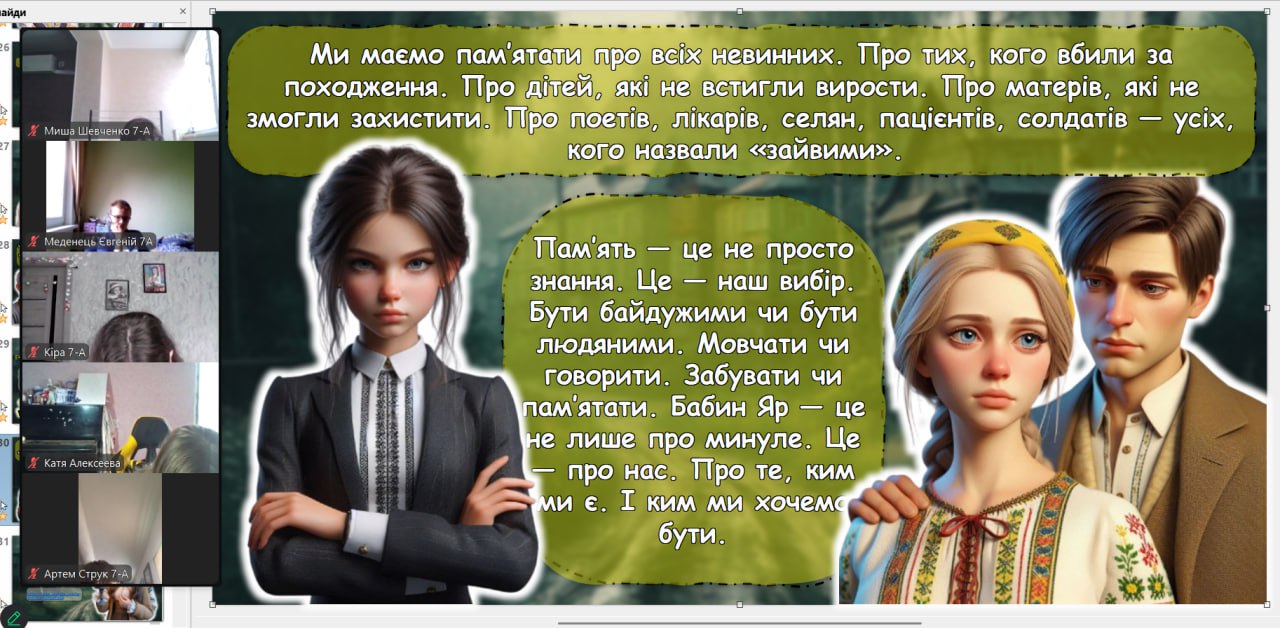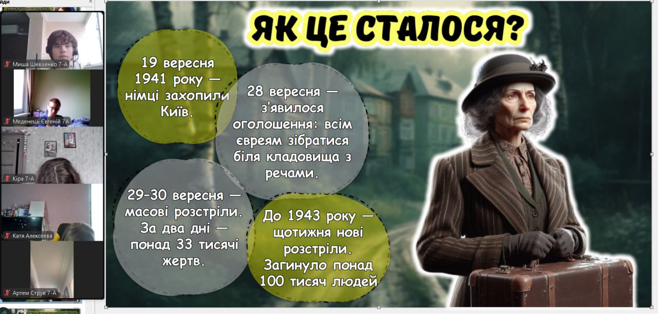 В Україні 29 вересня вшановують пам’ять жертв трагедії Бабиного Яру, що стала одним із найжахливіших символів Голокосту. Бабин Яр – місце пам’яті, де у 1941–1943 роках нацистами розстріляли близько 100 тисяч цивільних громадян і військовополонених. Серед них – євреї і роми, червоноармійці, комуністи, підпільники Організації українських націоналістів, в’язні Сирецького концтабору, «саботажники», порушники комендантської години та навіть пацієнти психіатричної лікарні імені Павлова. Нацистська операція стала однією з наймасштабніших каральних акцій Другої світової війни. З вихованцями проведені виовні години, години спілкування, історичні бесіди «Трагедія Бабиного Яру-в серці українського народу»