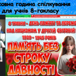 8 травня Україна відзначає День пам’яті та перемоги, вшановуючи загиблих у Другій світовій війні 1939–1945 років. У цей день Україна традиційно вшановує їх, висловлює повагу та вдячність усім борцям із нацизмом, увічнює пам’ять про загиблих воїнів і жертв найкривавішої і найжорстокішої в історії людства війни. З вихованцями санаторної школи № 11 проведені виховні години, інформаційні хвилини, години спілкування та виготовлення червоних маків