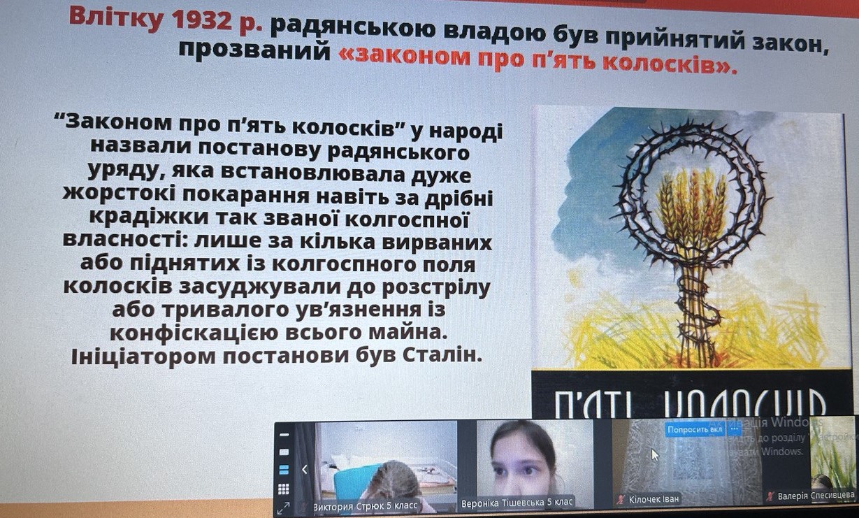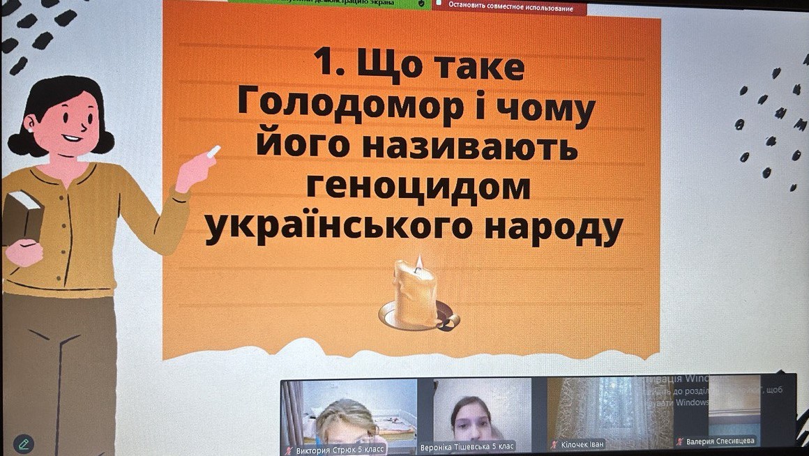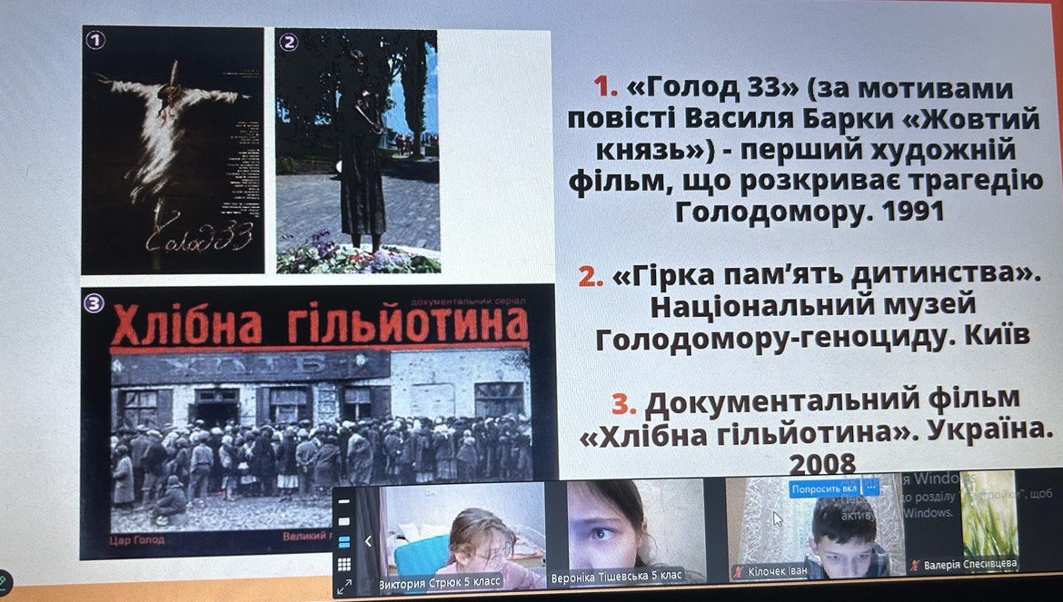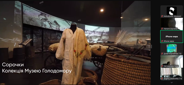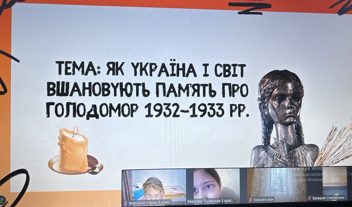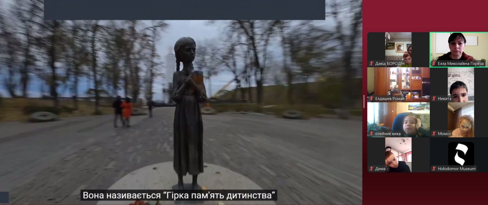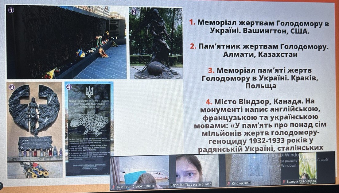 Щороку в четверту суботу листопада в Україні та світі вшановують пам’ять мільйонів жертв Голодомору 1932–1933 років. Пам’ять загиблих не просто від голоду внаслідок неврожаю, природного лиха, а жертв цілеспрямованого сталінського геноциду українців. Учні 2-9-х класів здійснили онлайн-екскурсію до Національного музею Голодомору-геноциду