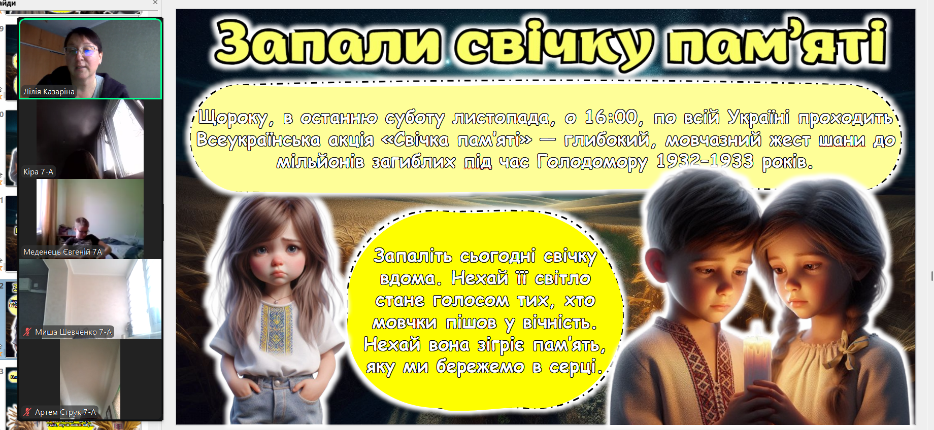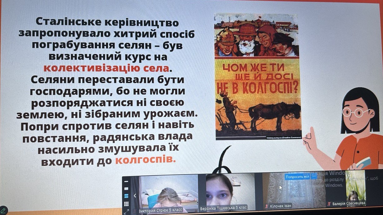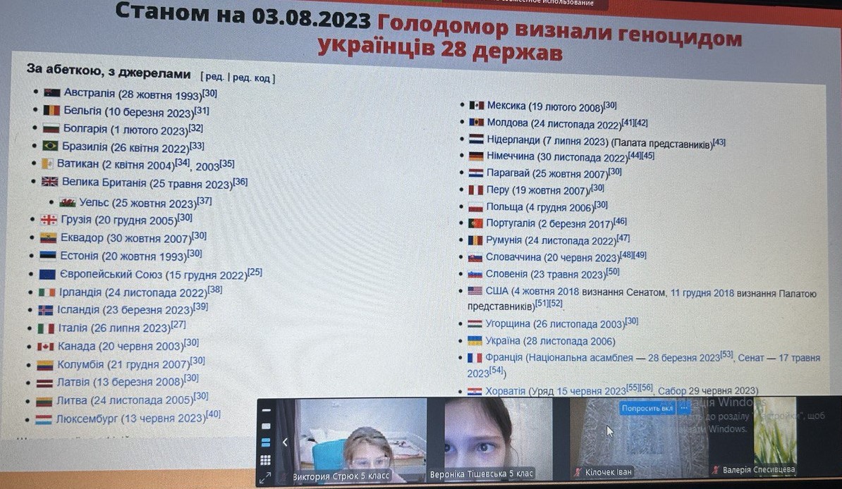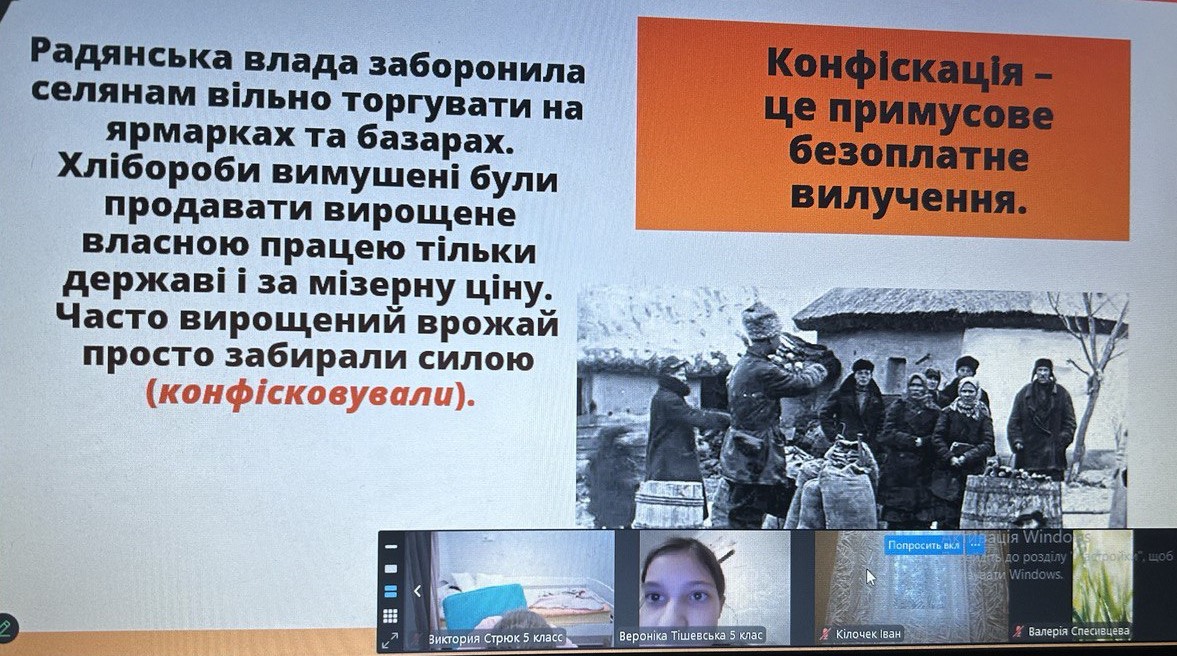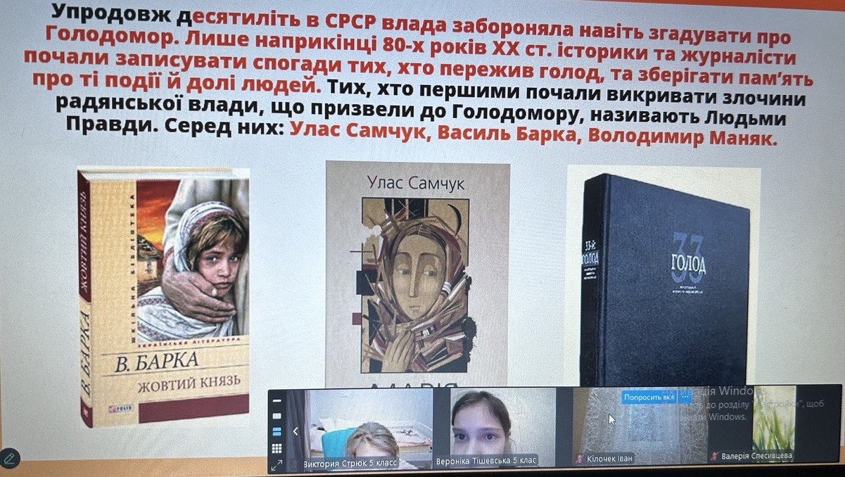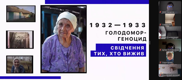 Щороку в четверту суботу листопада в Україні та світі вшановують пам’ять мільйонів жертв Голодомору 1932–1933 років. Пам’ять загиблих не просто від голоду внаслідок неврожаю, природного лиха, а жертв цілеспрямованого сталінського геноциду українців. Учні 2-9-х класів здійснили онлайн-екскурсію до Національного музею Голодомору-геноциду