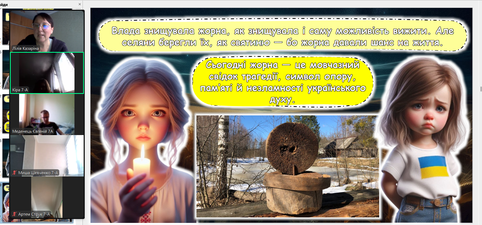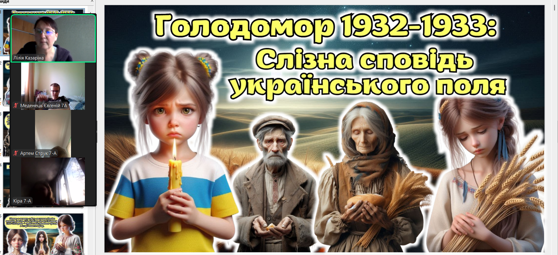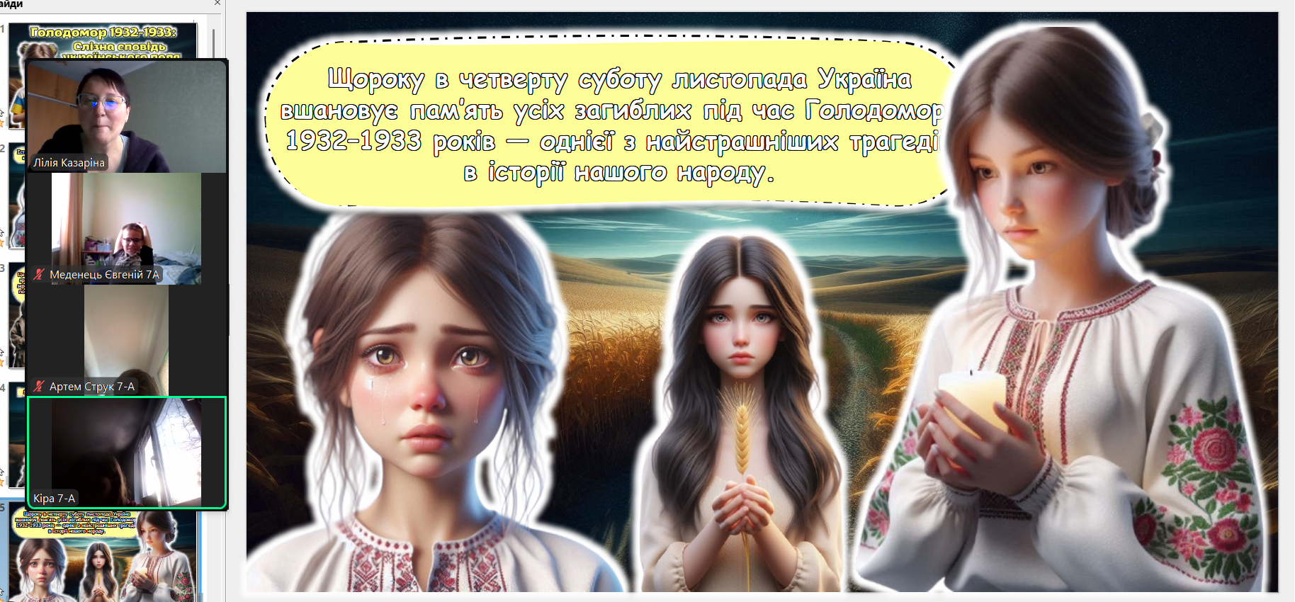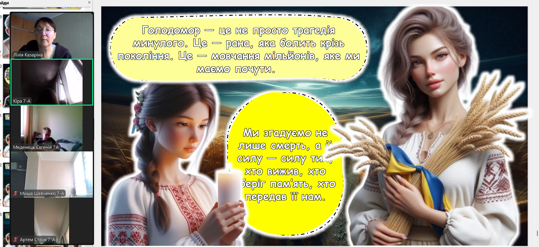 Щороку в четверту суботу листопада в Україні та світі вшановують пам’ять мільйонів жертв Голодомору 1932–1933 років. Пам’ять загиблих не просто від голоду внаслідок неврожаю, природного лиха, а жертв цілеспрямованого сталінського геноциду українців. Учні 2-9-х класів здійснили онлайн-екскурсію до Національного музею Голодомору-геноциду