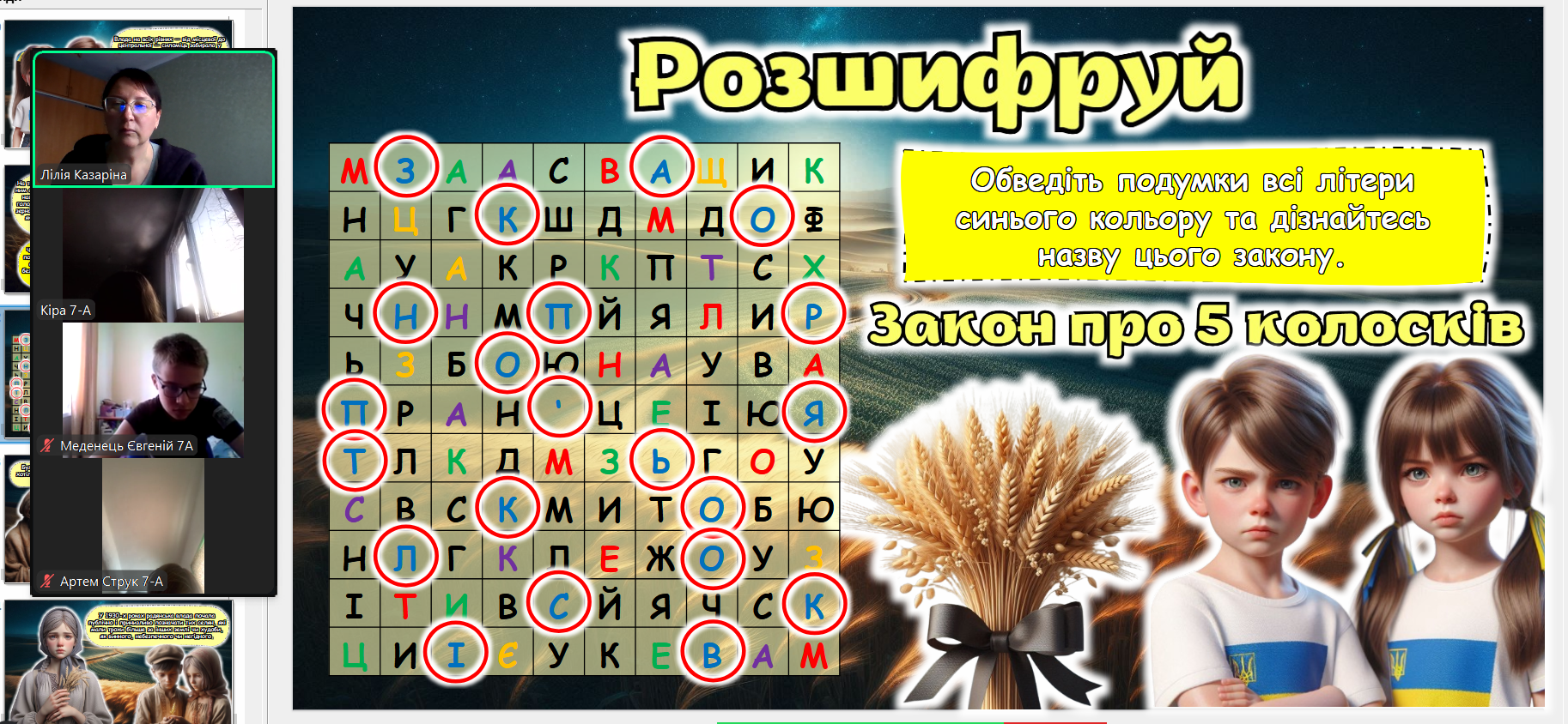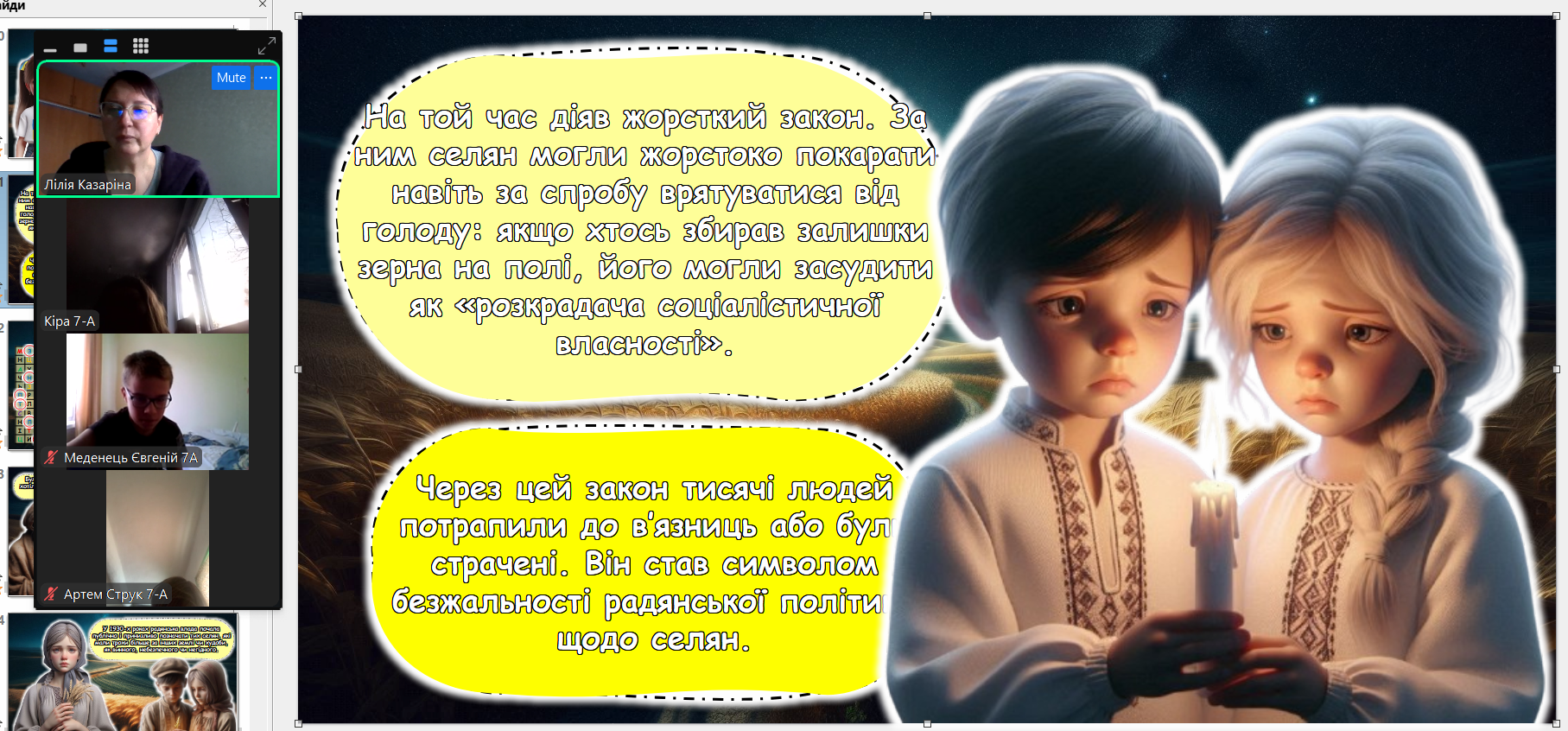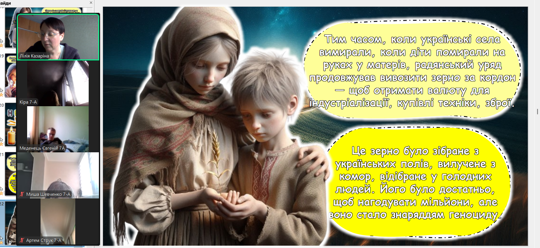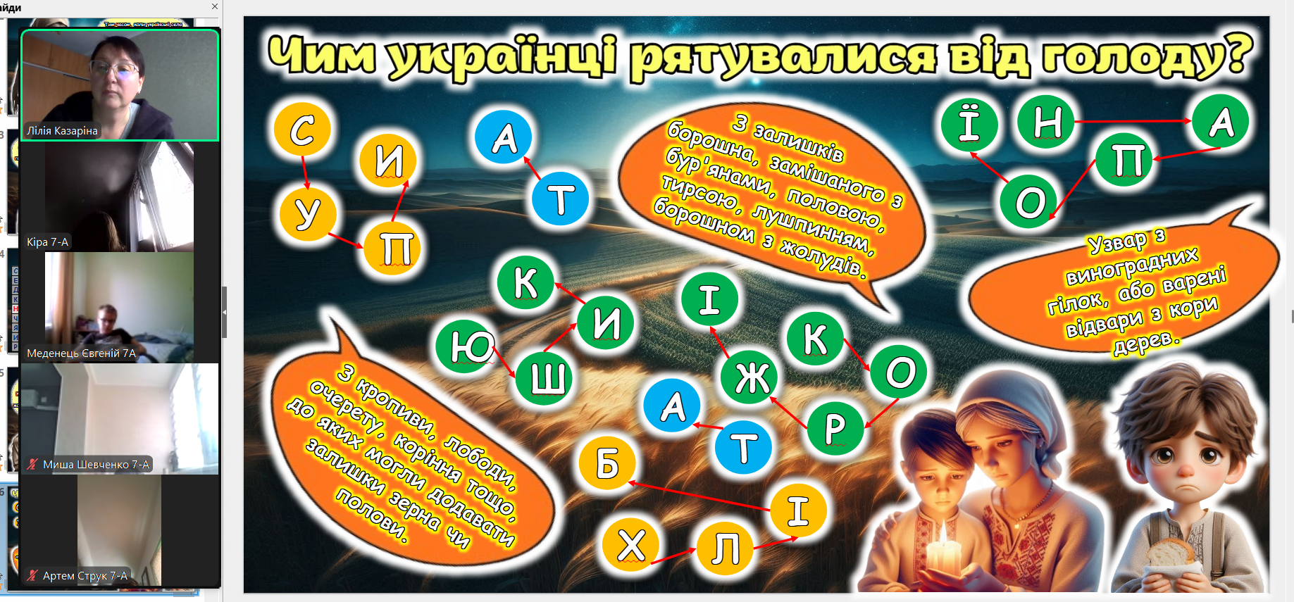 Щороку в четверту суботу листопада в Україні та світі вшановують пам’ять мільйонів жертв Голодомору 1932–1933 років. Пам’ять загиблих не просто від голоду внаслідок неврожаю, природного лиха, а жертв цілеспрямованого сталінського геноциду українців. Учні 2-9-х класів здійснили онлайн-екскурсію до Національного музею Голодомору-геноциду