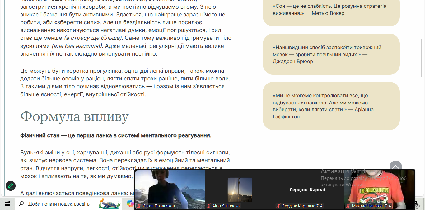 У рамках Європейсько тижня Ментального здоров’я з вихованцями проведено уроки практикум: «Фізична активність-інструмент для збереження ментального здоров’я», «Фізичне здоров’я. Зв’язок тіла й психіки: як фізичний стан впливає на ментальне здоров’я та що з цим робити», «Ендорфіновий біг», «Релаксація м’язів – зняття м’язових затискань»